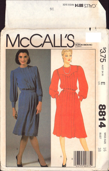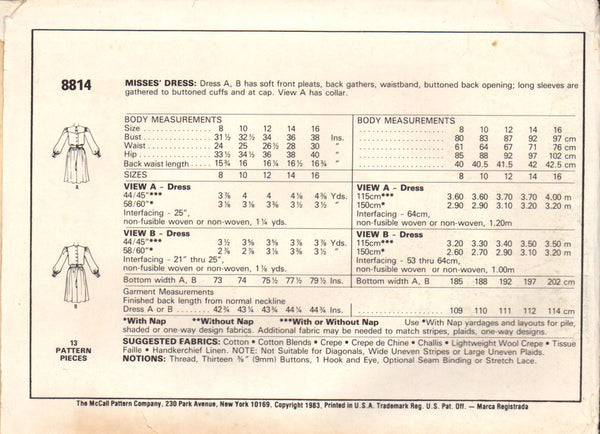 Dress A, B has soft front pleats, back gathers, wasitband, buttoned back opening, long sleeves are gathered to buttoned cuffs and at cap. View A has collar.
