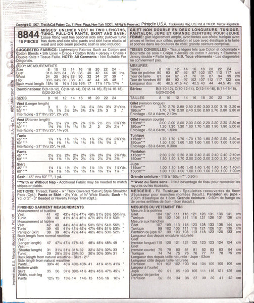 Loose fitting vest has optional side slits; pullover tunic has darts and side slits; pants and skirt have elastic at waist and side seam pockets; sash is also included.