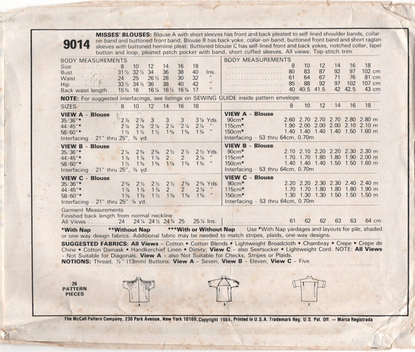 Blouse A with short sleeves has front and back pleated to self lined shoulder bands, collar on band, and buttoned front band. Blouse B has back yoke, collar on band, buttoned front band and short raglan sleeves with buttoned hemline pleat. Buttoned blouse C has self-lined front and back yokes, notched collar, lapel button and loop, pleated patch pocket with band, short cuffed sleeves. All views: top stitch trim.