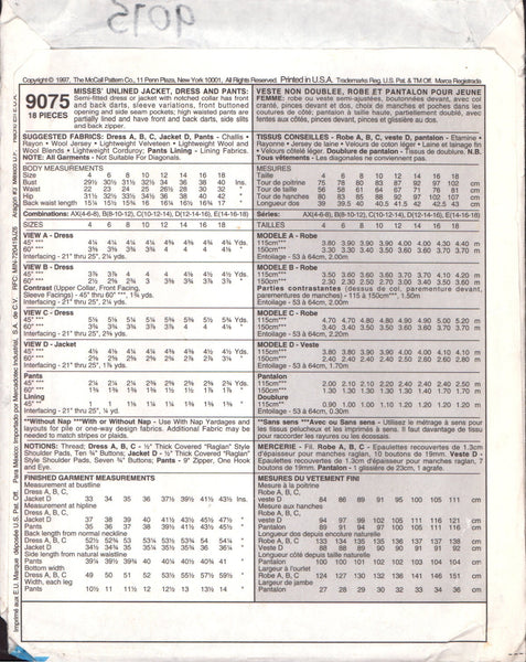 Unlined Jacket, Dress and Pants pattern is semi-fitted dress or jacket with notched collar -has front and back darts, sleeve variations, front buttoned opening and side seam pockets; high waisted pants are partially lined and have front and back darts, side slits and back zipper.