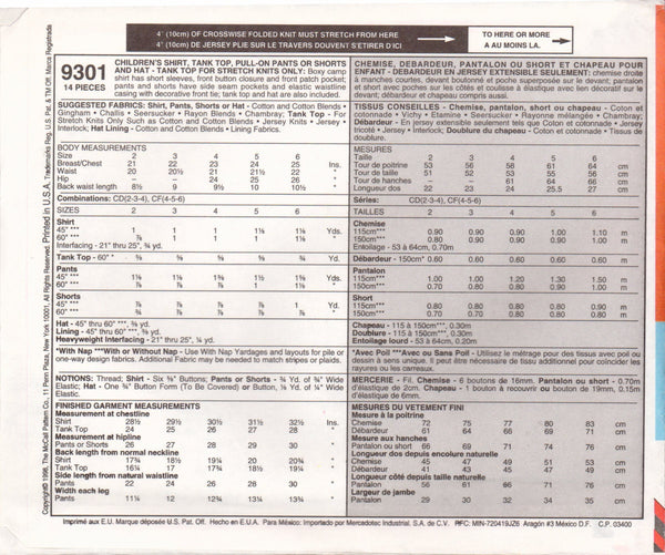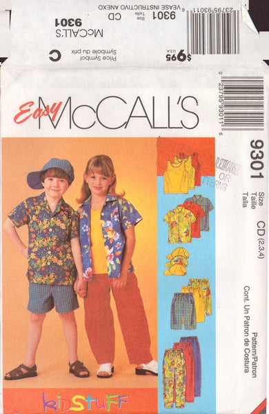 McCall's 9301 Sewing Pattern, Children's Shirt, Top, Pants or Shorts and Hat, Size 2-3-4, Uncut, Factory Folded