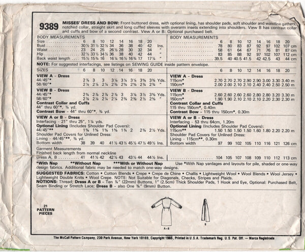 Front-buttoned dress, with optional lining, has shoulder pads, soft shoulder and waistline gathers, notched collar, straight skirt and long cuffed sleeves with overarm insets extending into shoulders. View B has contrast collar and cuffs and bow of a second contrast. View A or B: optional purchased belt.