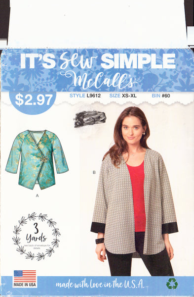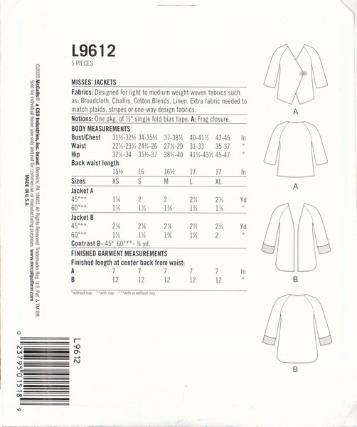 McCall's 9612 Sewing Pattern, Misses' Jackets, Size XS-XL, Uncut, Factory Folded