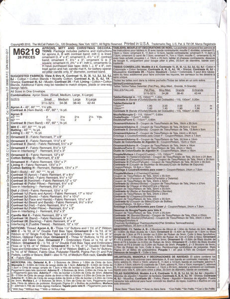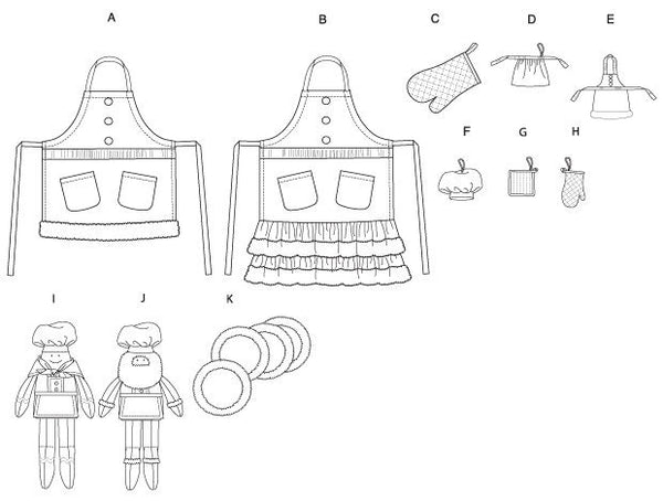 Package includes patterns and instructions for aprons, mitts, and ornaments.