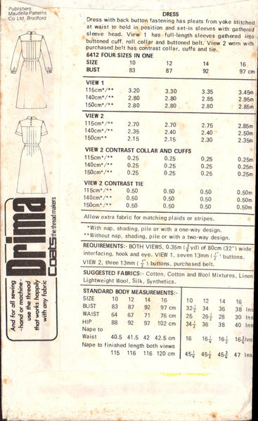 Dress with back button fastening has pleats from yoke stitched at waist to hold in position and set-in sleeves with gathered sleeve head. View 1 has full-length sleeves gathered into buttoned cuff, roll collar and buttoned belt. View 2 worn with purchased belt has contrast collar, cuffs and tie.