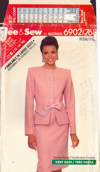 See&Sew 6902 Sewing Pattern, Jacket and Skirt, Size 12-14, Cut, CompleteAn alteration has been removed from one piece.The sleeve has been cut to short. The offcut is present.The pattern has been cut to size 14.