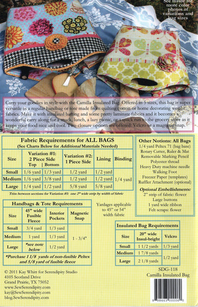 Carry your goodies in style with the Camilla Insulated Bag. Offered in 5 sizes, this bag is super versatile as a regular handbag or tote made from quilting cotton or home decorating weight fabrics. Make it with insulated batting and soe pretty laminate fabrics and it becomes a wonderful carry along for a snack lunch, a lazy picnic or a quick run to a grocery store as it keeps your food nice and cool. Two closure options are offered: Velcro or a magnetic strip.