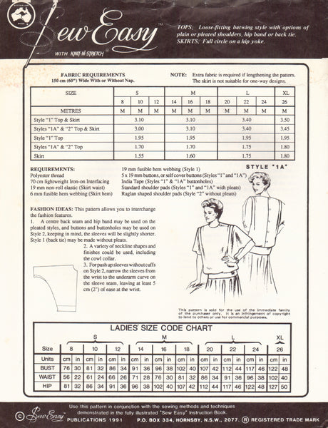 Sew Easy 159A Sewing Pattern Skirts and Tops, Size 8-26, Uncut, Factory Folded