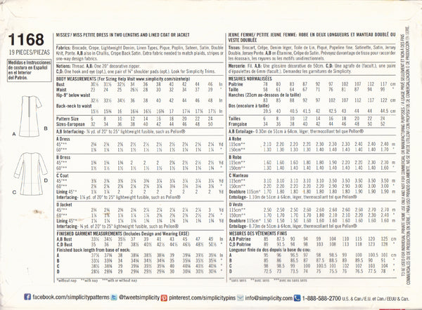 Simplicity 1168 Sewing Pattern, Dress & Coat or Jacket, Size 6-14, Uncut, Factory Folded