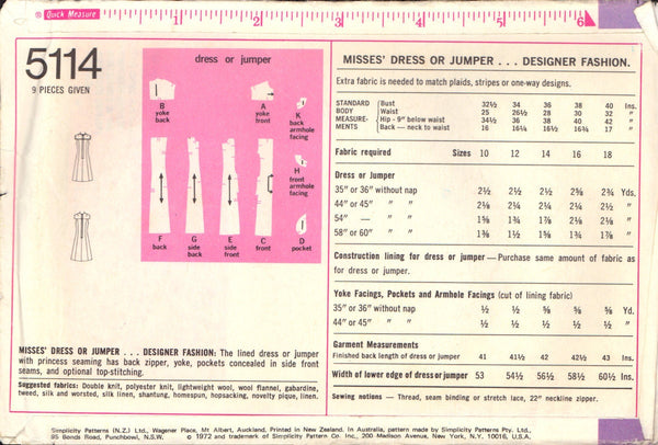 The lined dress or jumper with princess seaming has back zipper, yoke, pockets concealed in side front seams, and optional top-stitching.