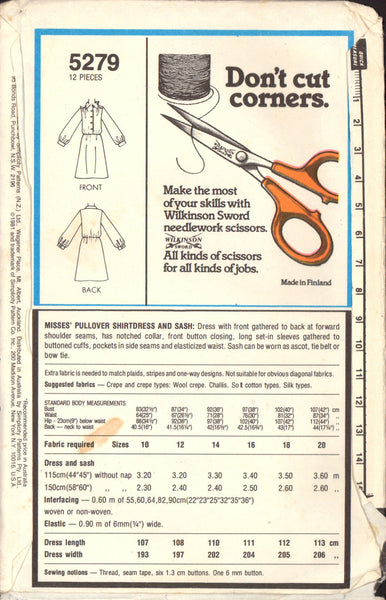 Dress with front gathered to back at forward shoulder seams, has notched collar, front button closing, long set-in sleeves gathered to buttoned cuffs, pockets in side seams and elasticized waist. Sash can be worn as ascot, tie belt or bow tie.