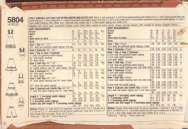 Simplicity 5804 Sewing Pattern, Camisole, Slips, Half Slip, Culotte Slip, Size 12, Cut, Complete