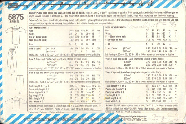 Tunic V. 1 and 2 or top V. 3 gathered to yoke has front bands, collar, extended shoulders and three-quarter length sleeves gathered to armholes. V. 1 and 2 have shirt-tail hem. Pants V. 2 have back zipper and waistband. Skirt V 3 has yoke, back zipper and front vent opening.