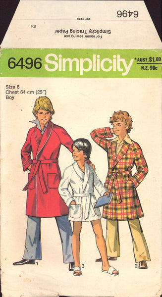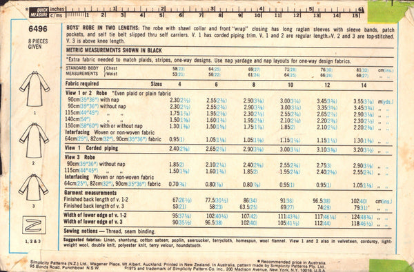The robe with shawl collar and front "wrap" closing has long raglan sleeves with sleeve bands, patch pockets and self tie belt slipped tru self carriers. V. 1 has corded piping trim. V. 1 and 2 are regular length. V. 2 and 3 are top stitched. V. 3 is above the knee.