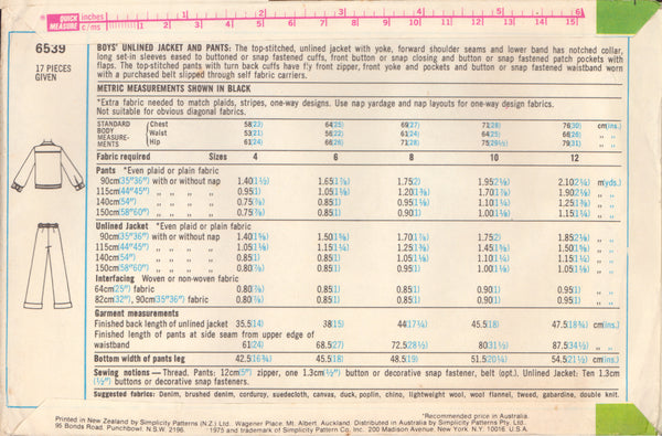 Simplicity 6539 Sewing Pattern, Boys' Jacket and Pants, Size 10, Cut, Complete