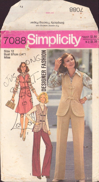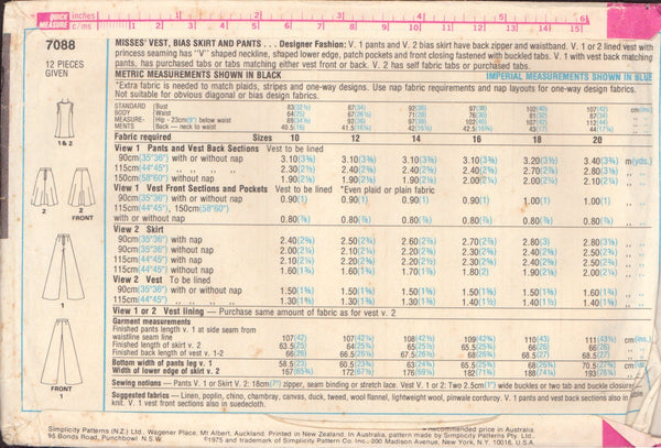 Simplicity 7088 Sewing Pattern, Vest, Bias Skirt and Pants, Size 12, Uncut, Factory Folded