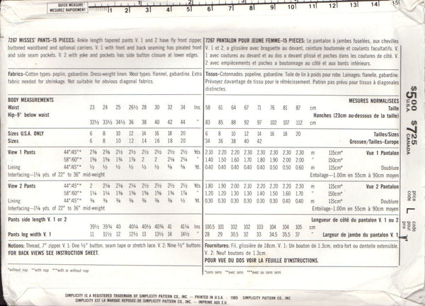 Ankle length tapered pants V1 and 2 have fly front zipper, buttoned waistband and optional carriers. V1 with front and back seaming has pleated front and side seam pockets. V2 with yoke and pockets has side button closure at lower edges.