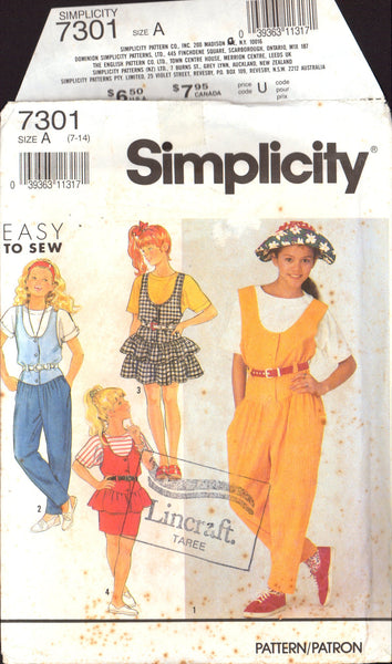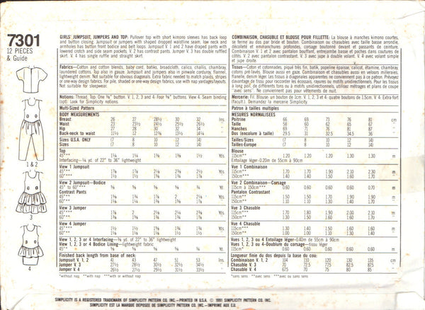 Pullover top with short kimono sleeves has back loop and button closing. Jumpsuit with shaped dropped waistline seam, low neck and armholes has button front bodice and belt loops. Jumpsuit V1 and 2 have draped pants with lowered crotch and side seam pockets. V2 has contrast pants. Jumper V3 has double ruffled skirt. V4 has single ruffle and straight skirt.