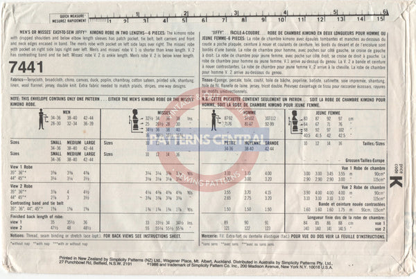 The kimono robe with dropped shoulders and below elbow length sleeves has patch pocket, tie belt, belt carriers and front and neck edges encased in band. The men's robe with pocket on left side laps over right. The misses' robe with pocket on right side laps right over left. Men's and misses' robe V. 1 is shorter than knee length. V. 2 has contrasting band and tie belt. Misses' robe V. 2 is ankle length. Men's robe V. 2 is below knee length.