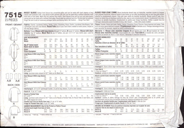 Simplicity 7515 Sewing Pattern Blouse Size 6-10 Uncut Factory Folded