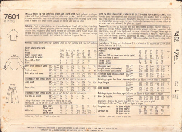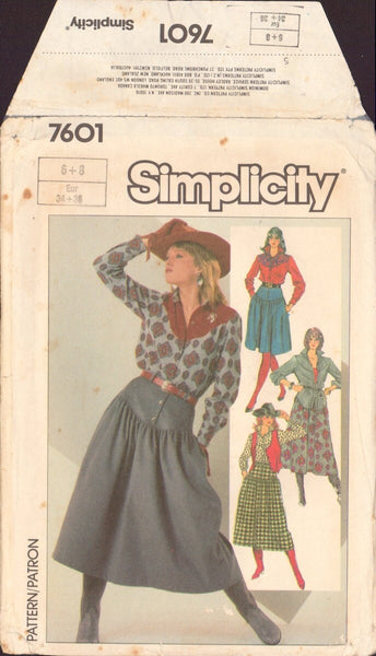 Simplicity 7601 Sewing Pattern, 2-Lengths Skirt, Shirt and Lined Vest, Size 6-8, Partially Cut, Complete