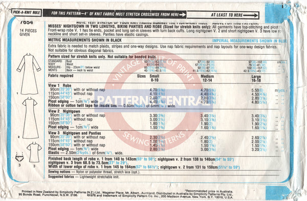 All garments have top-stitching and picot trim. Front-wrap robe V.1 has tie ends, pocket and long set-on sleeves with turn back cuffs. Long nightgown V. 2 and short nightgown V. 3 have low round neckline and short set-in sleeves. Panties have elastic casing.