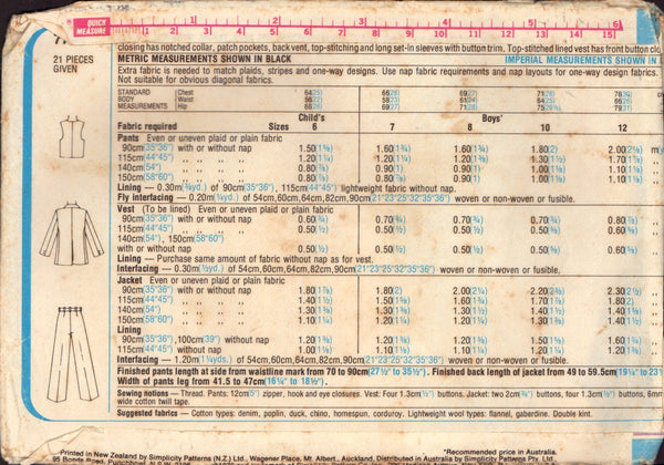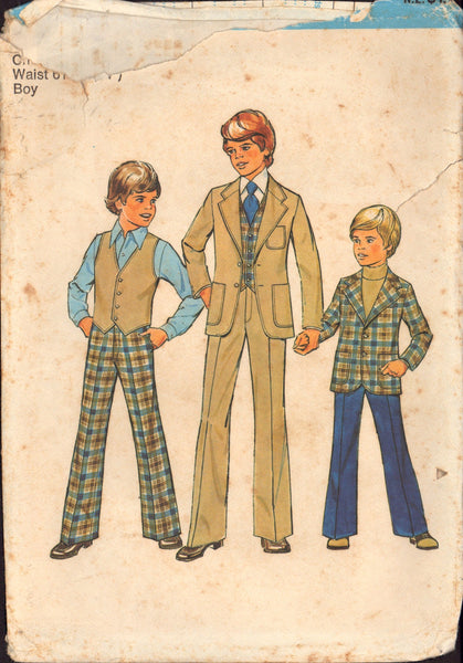 Pants with fly front zipper have side pockets, waistband and carriers. Lined jacket with front button closing has notched collar, patch pockets, back vent, top-stitching and long set-in sleeves with button trim. Top-stitched lined vest has front button closing.
