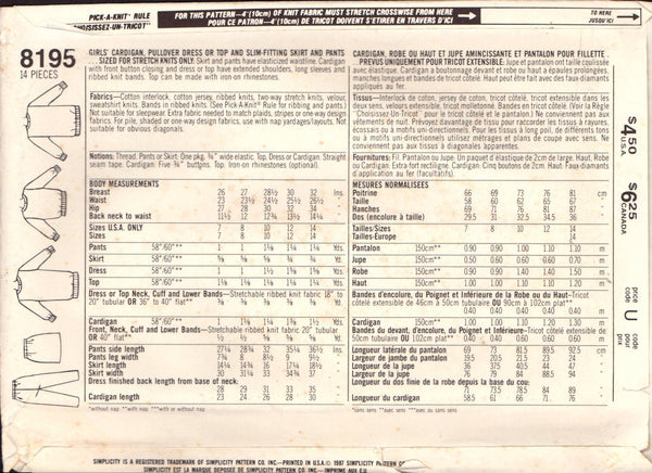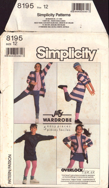 Simplicity 8195 Jiffy 5 Easy Piece Girls' Wardrobe: Cardigan, Top, Skirt and Pants, Uncut, Factory Folded, Sewing Pattern Size 12