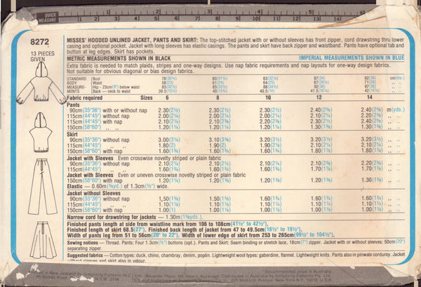 Simplicity 8272 Sewing Pattern, Skirt, Pants, Jacket, Size 10, Cut, Complete