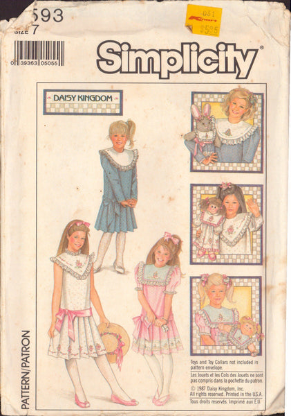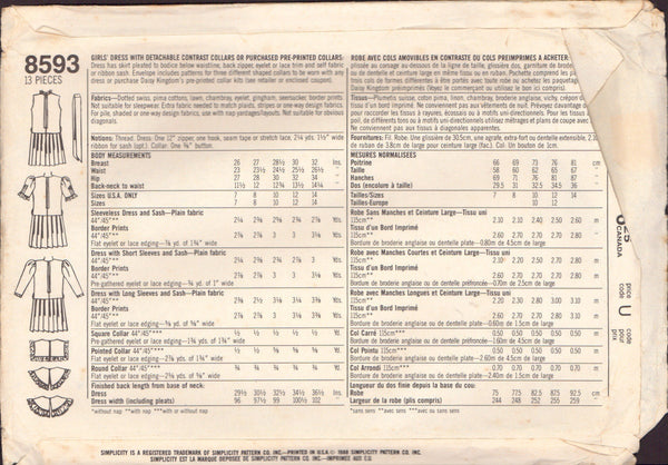 Simplicity 8593 Sewing Pattern, Girls' Dress with Detachable Collar, Size 7, Cut, Complete or Size 8, Uncut, Factory Folded
