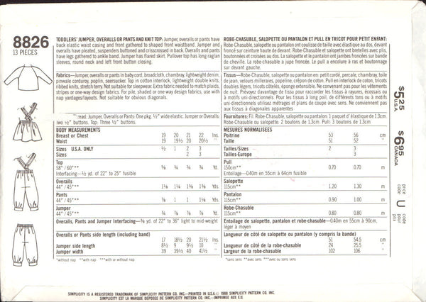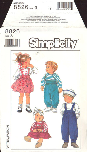 Jumper, overalls or pants have back elastic waist casing and front gathered to shaped front waistband. Jumper and overalls have pleated, suspenders buttoned and crisscrossed in back. Overalls and pants have legs gathered to ankle band. Jumper has flared skirt. Pullover top has long raglan sleeves, round neck and left front button closing.