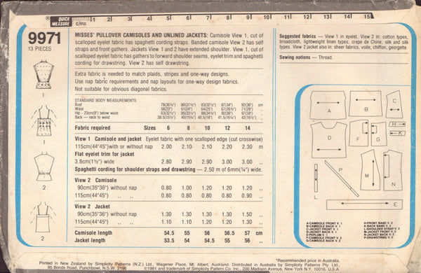Simplicity 9971 Sewing Pattern, Camisoles and Jackets, Size 6-8, Partially Cut, Complete