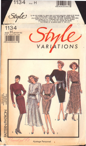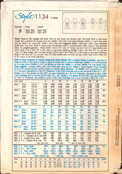 Dress has long sleeves and shoulder pads. Calf length flared or knee length straight skirt is gathered into dropped waist seam. Models 1 and 2 have front bodice buttoning. Models 3, 4 and 5 have centre back zip. Model 5 has stand collar. Models 4 and 5 have sash.