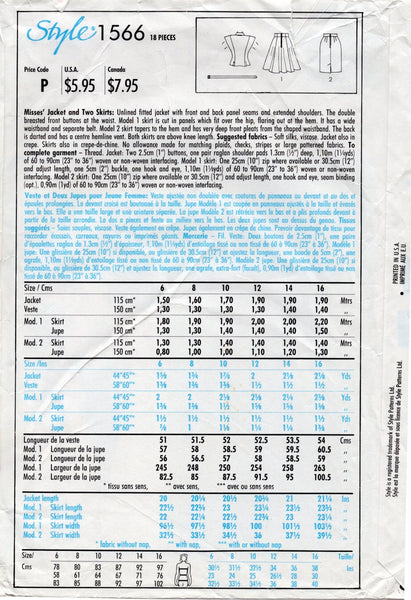 Unlined fitted jacket with front and back panel seams and extended shoulders. The double breasted front buttons at the waist. Model 1 skirt is cut in panels which fit over the hip, flaring out at the hem. It has a wide waistband and separate belt. Model 2 skirt tapers to the hem and has very deep front pleats from the shaped waistband. The back is darted and has a centre hemline vent. Both skirts are above knee length.
