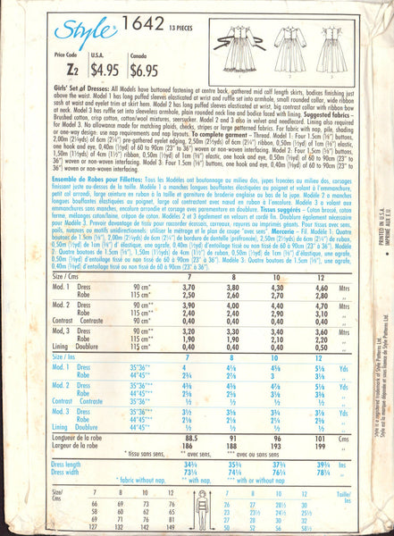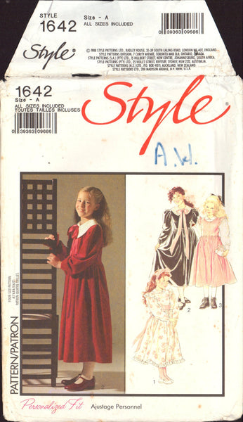All models have buttoned fastening at center back, gathered mid-calf length skirts, bodices finishing just above the waist. Model 1 has long puffed sleeves elasticated at wrist and ruffle set into armhole, small rounded collar, wide ribbon sash at waist and eyelet trim at skirt hem. Model 2 has long puffed sleeves elasticated at wrist, big contrast collar with ribbon bow at neck. Model 3 has ruffle set into sleeveless armhole, plain rounded neckline and bodice faced with lining.