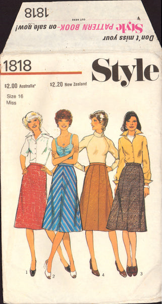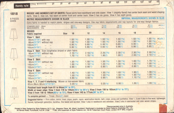 Flared skirts have waistband and side zipper. View 1 (slightly flared) has center back seam and waist shaping darts. View 2, bias cut, has seam at center front and center back. View 3 has six gores. View 4 has eight gores.