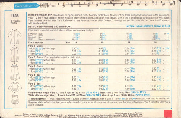 Flared dress or top has seam at centre front and centre back. All views of the dress have pockets concealed in the side seams. View 1 , 2 and 4 have scooped, ribbon threaded, draw-string neckline, and raglan-type sleeves. View 1 and 4 long sleeves are elasticized at wrist edge. View 2 sleeves are short. View 3 and 5 , sleeveless, have elasticized, shaped frill at lowered top edge, and self fabric shoulder ties. View 1 and 3 are worn with purchased belt.