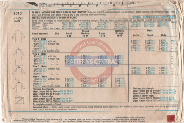 Robe has pointed collar and revers, set-in sleeves, patch pockets and self fabric tie belt. View 1 and 4 are trimmed with braid. View 2 and 3 are trimmed with top-stitching.