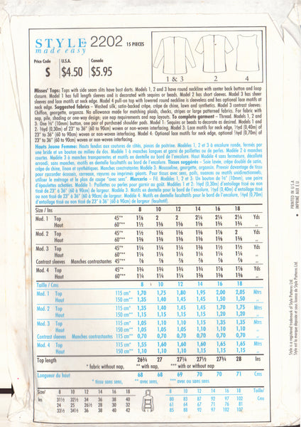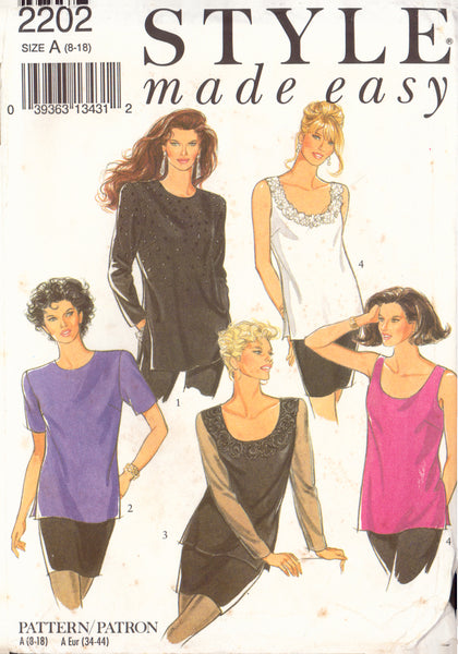 Style 2202, Misses' Tops, Sewing Pattern, Size 8-16, Partially Cut, CompleteThe pattern has been partially cut to size 16.