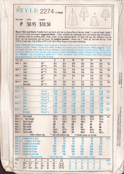 Style 2274 Sewing Pattern Women's Skirt and Shorts, Size 6-16, Uncut, Factory Folded