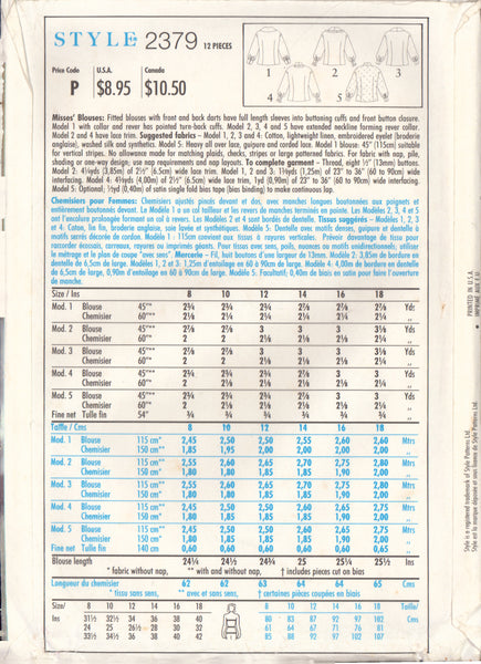 Style 2379 Sewing Pattern, Misses' Blouse, Size 8-18, Cut, Complete