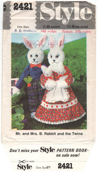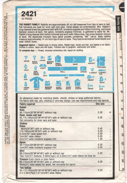 Rabbits are approximately 19" (49 cm) tall measured from tips of ears to feet. Felt remnants are used for inner ears and eyes. Facial details are embroidered. Mrs Rabbit's long-sleeved dress has gathered skirt with frill, broderie anglaise and ribbon trimming, and press fastener closure at back. Her apron, broderie anglaise trimmed, is gathered to waist tie. Mr Rabbit's long sleeved shirt button trimmed and worn with ribbon bow, has press fastener closure at back. His elasticized trousers have patch pockets containing felt carrot. Baby rabbits measure approximately 5.5" (14 cm) from tips of ears to base. They have embroidered facial details and wear ribbon bows.