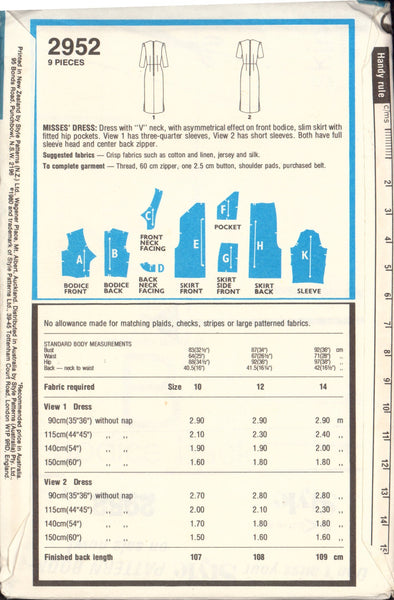 Dress with V neck, with asymmetrical effect on front bodice, slim skirt with fitted hip pockets. View 1 has three quarter sleeves, View 2 has short sleeves. Both have full sleeve and centre back zipper.
