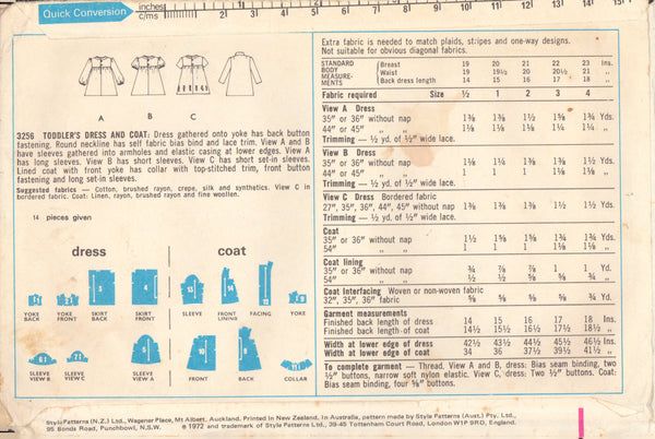Style 3256 Sewing Pattern, Toddlers' Dress and Coat, Size 2, Cut, Complete