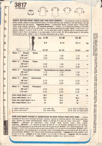 Style 3817 Sewing Pattern Babies' Dress and Romper, Size 18 months, Cut, Complete