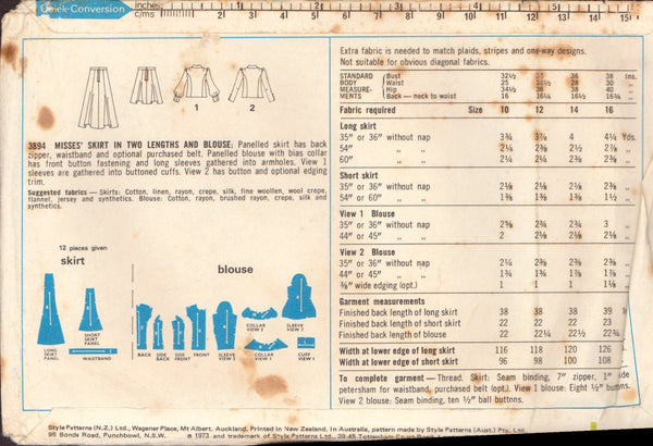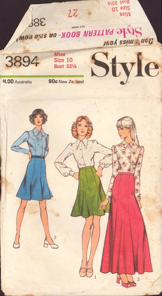 Style 3894 Sewing Pattern, Skirt and Blouse, Size 10, Partially Cut, Complete