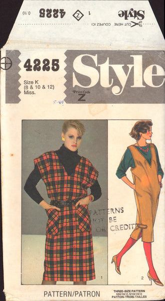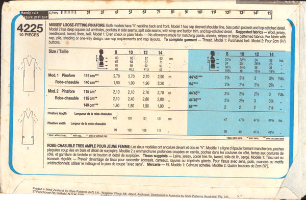 Both models have V neckline back and front. Model 1 has cap sleeved shoulder line, bias patch pockets and top-stitched detail. Model 2 has deep square cut armholes, pockets in side seams, split side seams, with strap and button trim.