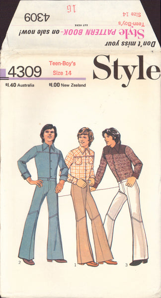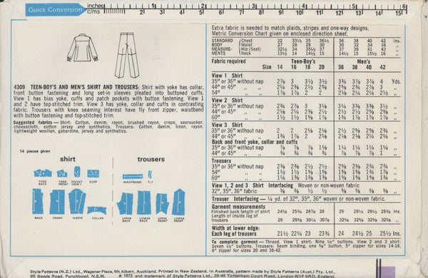 Shirt with yoke has collar, front button fastening and long set-in sleeves pleated into buttoned cuffs. V1 has bias yoke, cuffs and patch pockets with button fastening. V1 and 2 have top stitched trim. V3 has yoke, collar and cuffs in contrasting fabric. Trousers with knee seaming interest have fly front zipper, waistband with button fastening and top stitched trim.