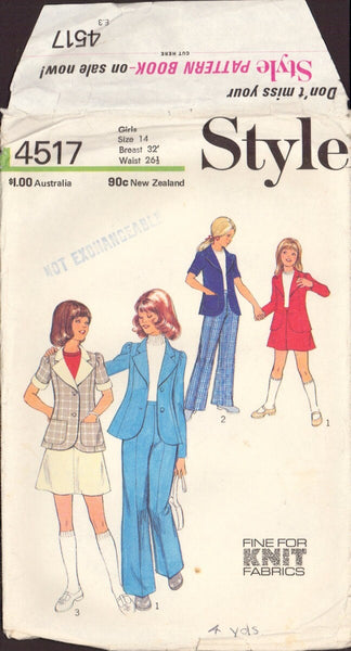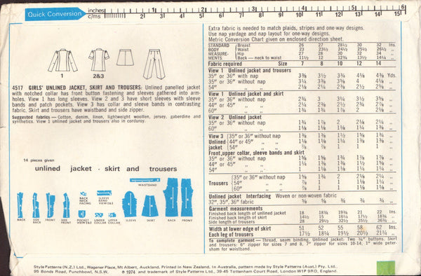 Style 4517 Sewing Pattern, Girls' Jacket, Skirt and Trousers, Girl Size 14, Cut, Incomplete
