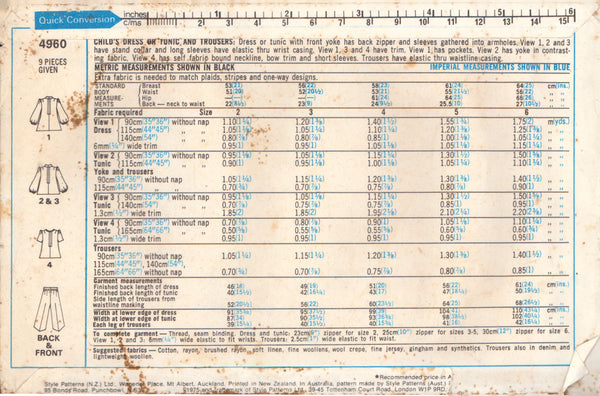 Style 4960 Girls' Dress or Tunic and Trousers, Size 4, Cut, Complete